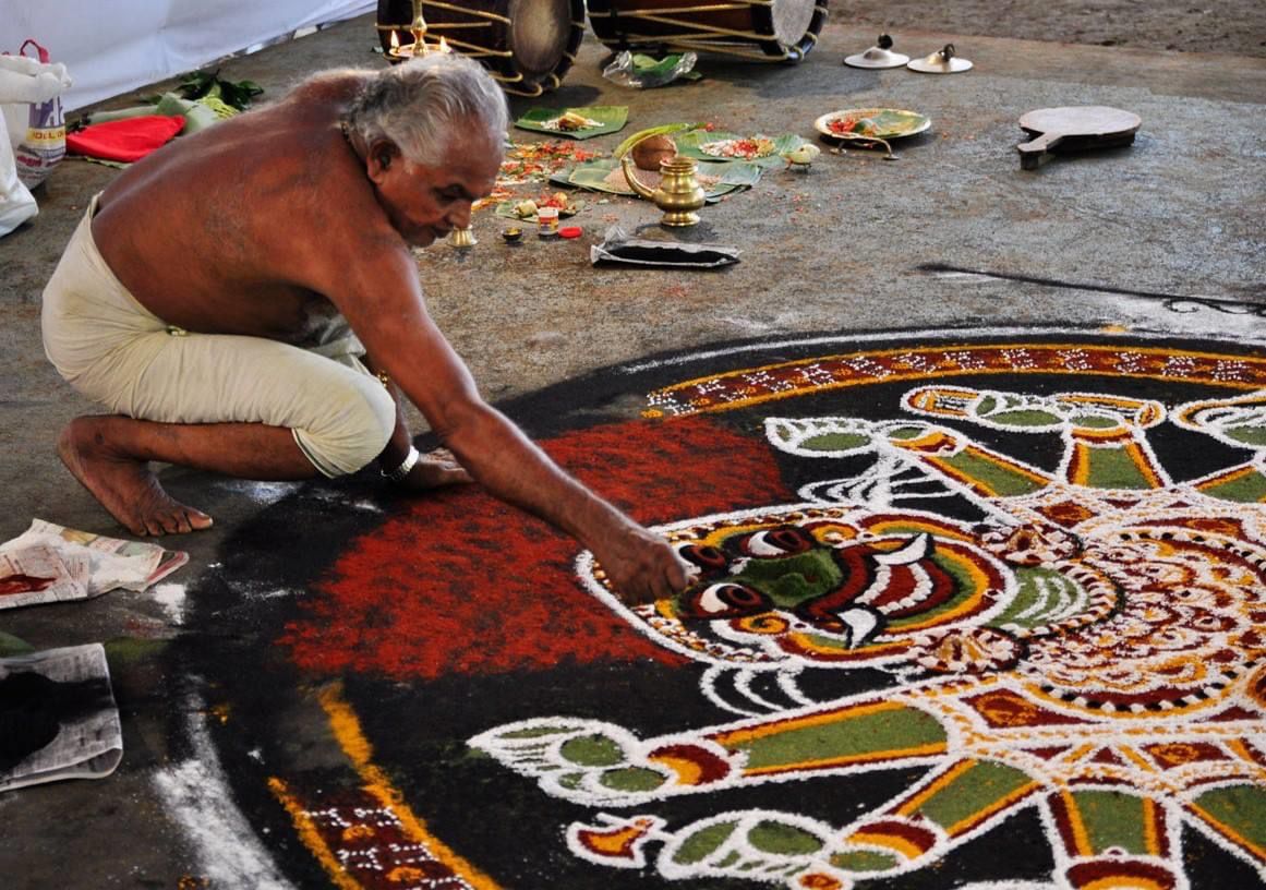 ഭദ്രകാളിയുടെ രൂപം അഞ്ചു നിറത്തിലുള്ള പൊടികളാൽ (അരിപ്പൊടി, കരിപ്പൊടി,മഞ്ഞൾപ്പൊടി, പച്ചപ്പൊടി,ചുവന്ന പൊടി) കളം എഴുതി , ആ കളത്തിനു മേൽശാന്തി ക്രീയകളാൽ ജീവൻ നൽകി ഭഗവതിയെ സ്വീകരിച്ചു ഇരുത്തി നിവേദ്യം നൽകി പ്രസന്നയാക്കി ശേഷം കുറുപ്പ് സർവൈശ്വര്യ അഗ്നി നാളത്താൽ കളത്തിനു ചുറ്റും ഉഴിഞ്ഞു സ്തുതിച്ചു പാടി ഭഗവതിയെ സന്തോഷിപ്പിച്ചു തിരികെ അയച്ചു കളം മായ്ക്കുന്നതോടെ കളമെഴുത്തും പാട്ട് എന്ന വഴിപാട് പൂർണ്ണമാകുന്നു. ദാരികവധം കഴിഞ്ഞതിനു ശേഷമാണ് ഭദ്രകാളിയുടെ കളമെഴുത്തുപാട്ടിന് ജന്മം എടുത്തത്. പാണ്ഡ്യരാജവംശത്തിൻ്റെ പടിഞ്ഞാറുള്ള മലനാട് വസിക്കുന്നവരുടെ പരദേവതയായി വാണരുളുന്നതിന് ഭദ്രകാളിയെ ഇവിടെ കുടിയിരുത്തുകയും, പരശുരാമനാൽ നിർമ്മിതമായ ഭഗവതി ക്ഷേത്രങ്ങളിൽ ഭഗവതിയെ ആരാധിക്കുന്നതിനുള്ള ഭദ്രകാളി പാട്ട് എന്ന കളംപാട്ട് നടത്തുവാനായി അവകാശമുള്ള കുറുപ്പ് മുഖേന ആരംഭിക്കുകയും ചെയ്തു. ക്ഷേത്രരൂപ സങ്കല്പം ഉടലെടുക്കുകയും പൂജാവിധി ആരാധനാ സമ്പ്രദായങ്ങൾ എന്നിവയോടൊപ്പം ധൂളിചിത്ര ആരാധനാ രീതിയായി കളം പാട്ടിനെ കളമെഴുത്തു പൂജ തിരിയുഴിച്ചിൽ പാട്ട് കളം മായ്ക്കൽ എന്നിങ്ങനെ ചിട്ട ചെയ്തതാണെന്ന് കരുതാം.